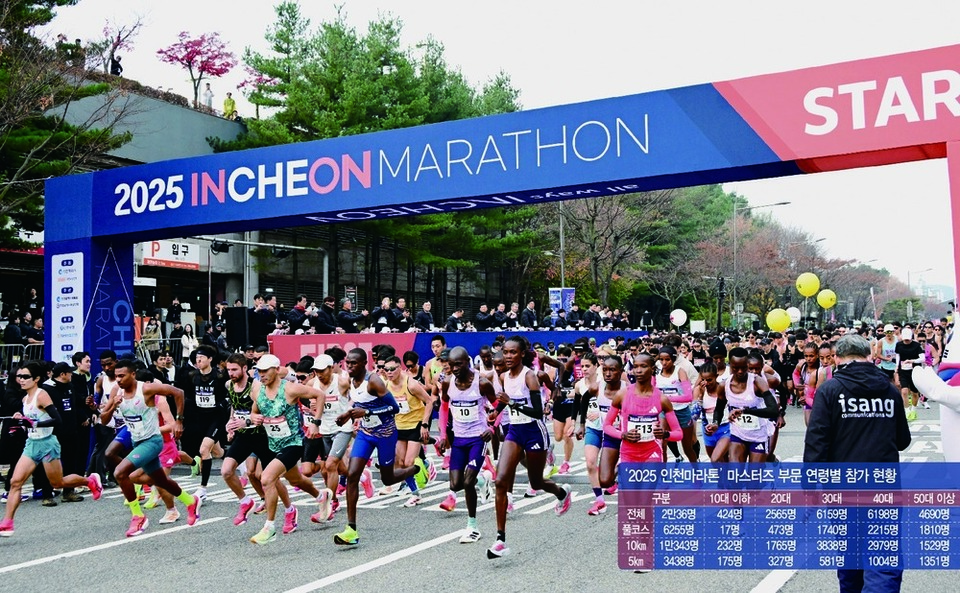 올해 처음 열린 인천마라톤에는 전국 각지에서 2만여명이 참여하며 높은 관심을 받았다. 마스터즈 부문 참가자 2만36명 가운데 인천에서 1만796명으로 가장 많이 참가했지만 경기와 서울에서도 각각 5849명, 2464명이 인천문학경기장으로 왔다.